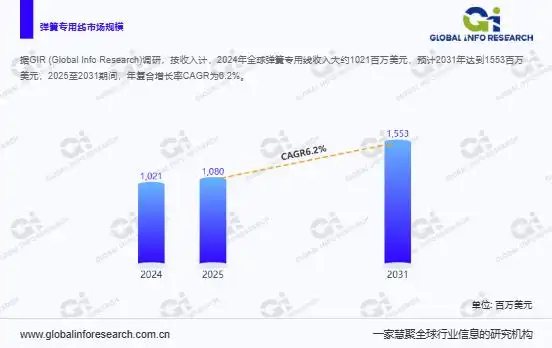 从市场发展态势来看,据 GIR(Global Info Research)的专业调研数据,以收入为统计依据,2024 年全球弹簧专用线收入约为 1021 百万美元,预计到 2031 年将增长至 1553 百万美元。在 2025 至 2031 年期间,该市场的年复合增长率(CAGR)预计为 6.2%。这一稳健增长背后,是汽车行业的持续发展(尤其是新能源汽车对高性能弹簧需求的提升)、家电与电子设备的更新迭代、机械设备制造业的技术升级以及航空航天领域对高精度弹簧需求的增加,多重需求叠加推动弹簧专用线市场不断扩容,展现出良好的发展潜力。